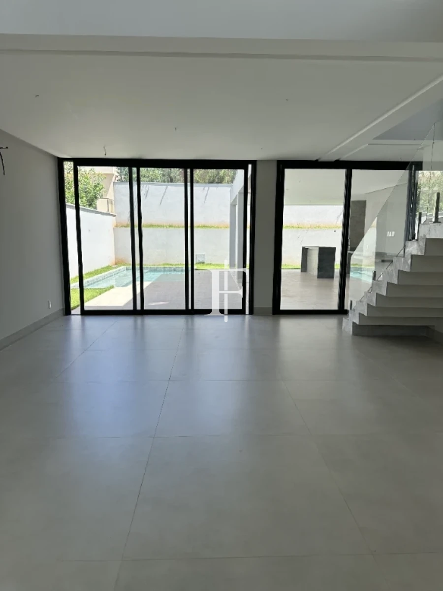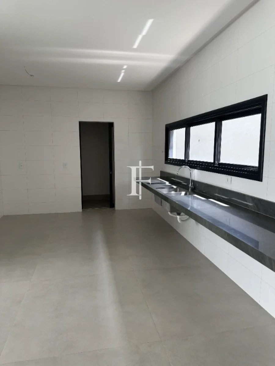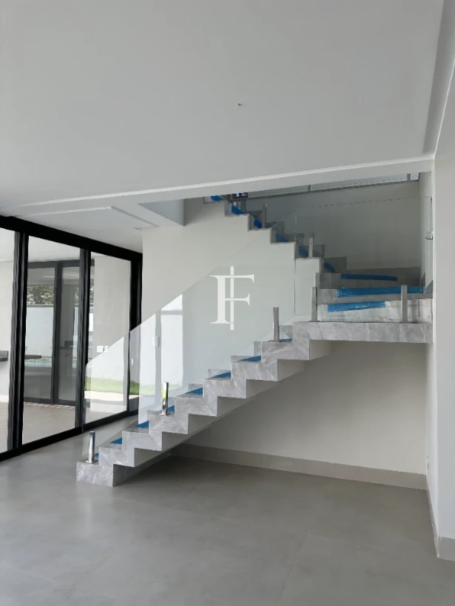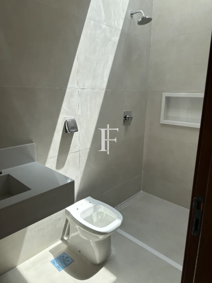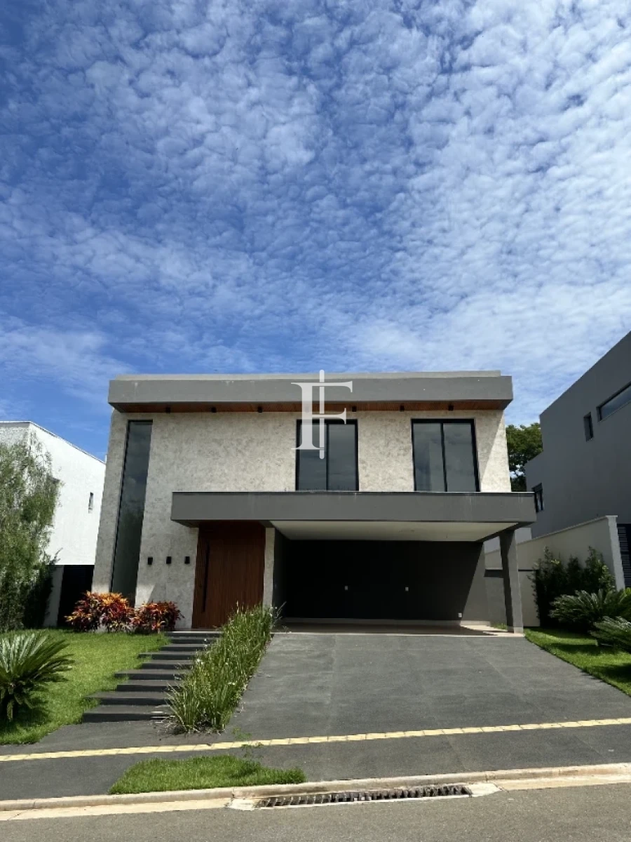 O imóvel possui 380m² distribuídos em 5 suítes amplas, sala de estar/jantar e área gourmet. Fachada revestida em pedra Bege Bahia, esquadrias em alumínio preto, pisos cerâmicos Eliane retificados e bancadas em quartzito Wakanda Light na cozinha.