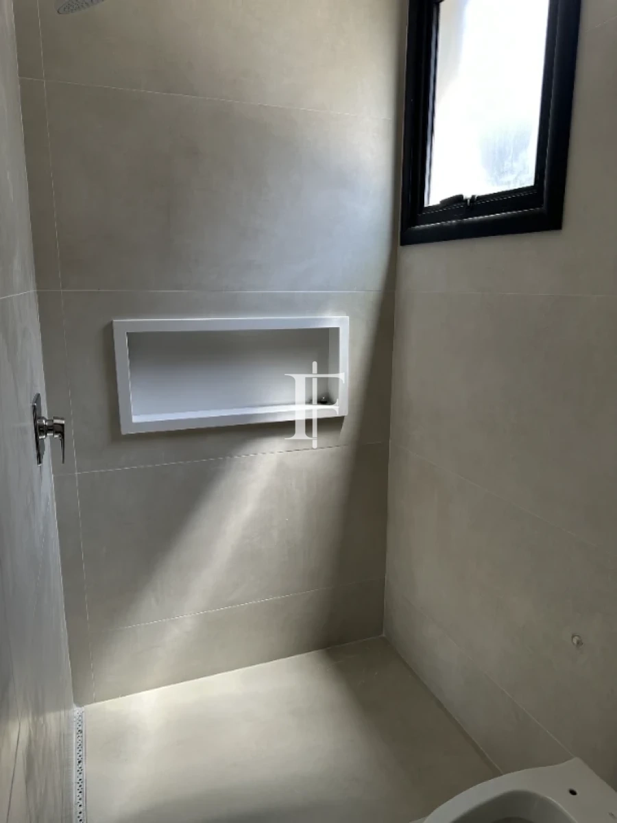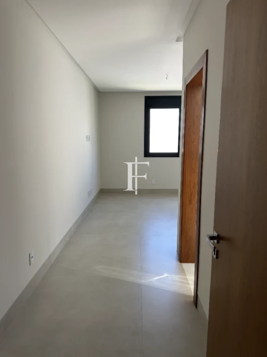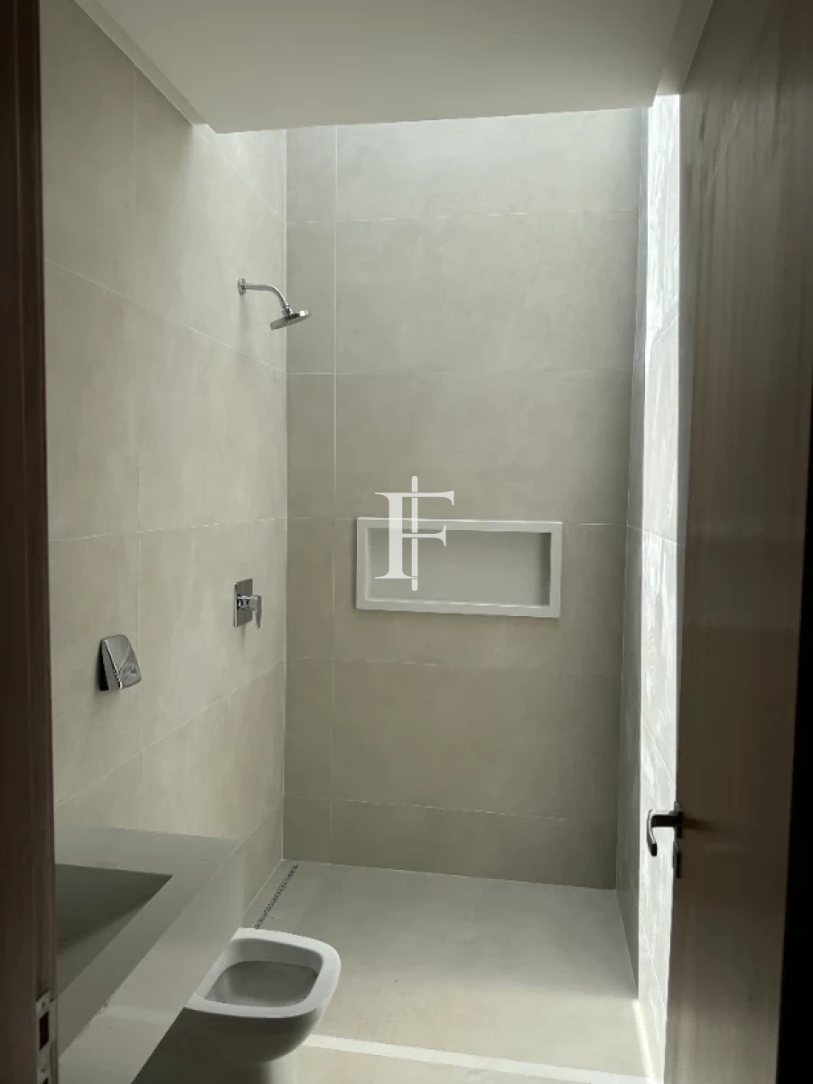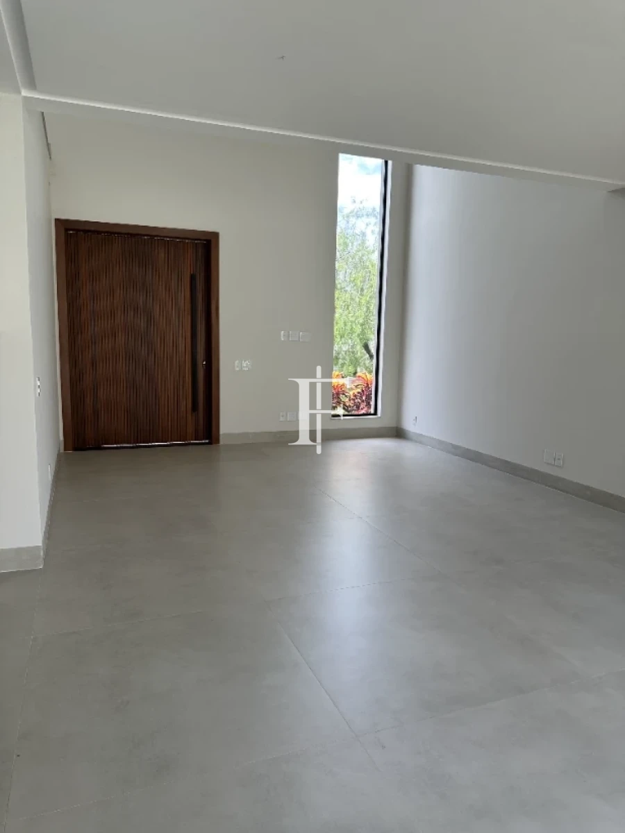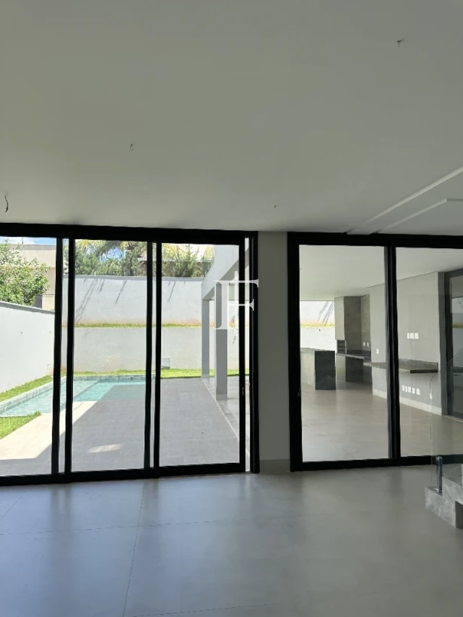 O imóvel possui 380m² distribuídos em 5 suítes amplas, sala de estar/jantar e área gourmet. Fachada revestida em pedra Bege Bahia, esquadrias em alumínio preto, pisos cerâmicos Eliane retificados e bancadas em quartzito Wakanda Light na cozinha.